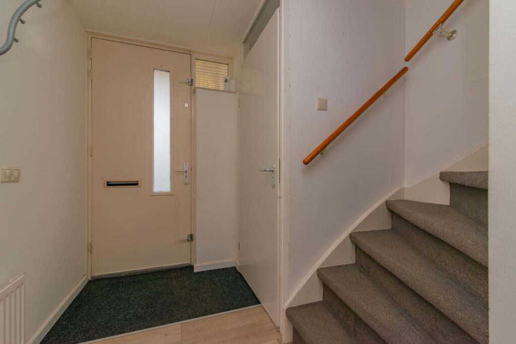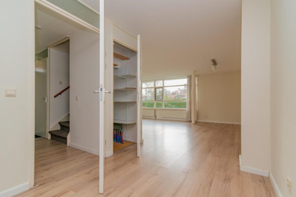 Via grote zijtuin ca. 21,00 x 5,00 met een fraaie groene heg rondom alsmede bomen, entree naar voordeur met luifel op de kopsekant van de woning, centrale hal met meterkast, garderobe en toilet met fontein. Deur naar heerlijk lichte en gezellige L-vormige woonkamer ca. 6,50 x 4,50 met grote raampartij en erker waardoor extra veel lichtinval, vrij uitzicht op plantsoen, diepe vaste kast onder de trap.