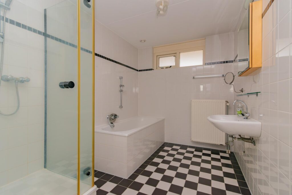 Grote lichte badkamer ca. 3,10 x 2,15 met hoekdouche, ligbad en vaste wastafel met spiegelkast.